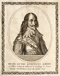 On 27[1] or 28 September,[2] Wreth made contact with the enemy's rearguard at the village of Willstätt, between Offenburg and the Rhine river, while the bulk of the Swedish army was in Kehl in preparation for the crossing.[6] As Otto rode out with 15 companions to command his rearguard,[6] he stumbled upon some Bavarian cuirassiers of the regiment of Keller, who mistook him for a Catholic officer. When he jumped into the Kinzig stream with his horse to escape, they realized their mistake and opened fire on him; he only received a light wound.[8] Willstätt was burned as a result of the skirmish.[9]