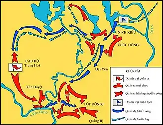 The plan was that upon hearing enemy weapons fire, the entire Ming force would concentrate its arrows upon the enemy formation and attack. However, Đinh Lễ and Lý Triện discovered this and ordered their troops to remain silent and not move. Due to this, the Ming assumed there were no nearby enemies, and took a shortcut. The Ming walked into an ambush near the Yên Duyệt River, in which the Lam Son forces suddenly emerged and advanced into the villages of Tột Động and Chúc Động, surprising and routing the Ming forces who attempted to flee across the river. Thousands were killed in the melee, and many more reportedly drowned, with Vietnamese sources claiming that 50,000 Ming soldiers died along with 10,000 being captured as prisoners of war.[15] Wang Tong himself was wounded and fled with Ma Qi back to Dong Quan.