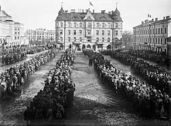 The Battle of Tampere was a 1918 Finnish Civil War battle, fought in Tampere, Finland from 15 March to 6 April between the Whites and the Reds. It is the most famous and deadly of all the Finnish Civil War battles.[2][3] Its bloody aftermath saw the Whites execute hundreds of captured Reds with another 11,000 prisoners sent to the Kalevankangas camp.[4]