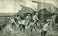 On the Japanese side were the 3rd, 4th, 5th and 6th Divisions of the Japanese Second Army under General Oku Yasukata.[1] The combined force had over 64,000 men, including 46,000 infantry, and 252 guns. After the victory at the Battle of Telissu, General Oku rested for four days for re-supply, which was delayed due to heavy rains, and to bring his 6th Division up to full strength. Although the Japanese were moving parallel to the railway line and the Russians had left behind over 300 freight cars at Dalny, the Japanese were unable to utilize the railway due to lack of locomotives. Locomotives procured by the Japanese matching the Russian railway gauge prior to the start of the war had been sunk by Russian commerce raiding in the Sea of Japan. The Japanese improvised by hauling the freight cars by teams of 16 men per car, and in addition hired 70 junks from the Chinese to move supplies up the coast to a point a couple of miles from the Japanese troop deployment.