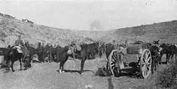 The divisional supply trains were withdrawn back to Karm, where water was readily available, because 30,000 animals in the Beersheba area needed water.[88] Meanwhile, the horses of the 1st, 2nd Light Horse, 5th Mounted and New Zealand Mounted Rifle Brigades, fighting in the Tel el Khuweilfe area, had only one really good drink during the four days they were in the area, even though the 7th Mounted Brigade found enough water on the east of the line for their horses.[89] The 8th Light Horse Regiment, having suffered three killed and 14 wounded on 3 November, retired with the 1st Light Horse Brigade back to Beersheba, where the regiment watered for the first time in 39 hours. The horses of the 1st Light Horse Brigade had, by then, been 30 hours without water.[66][89]