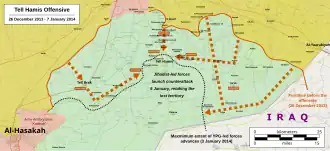 On the night of 26/27 December 2013, the YPG, gathered in al-Yaarubiyah, launched the offensive on Tell Hamis and Tell Brak with several hundred fighters on technicals and improvised armoured vehicles.[3] On the first day they captured villages to the east and south of Tell Brak and north, east, and west of Tell Hamis.[10] Tell Brak itself was also reported captured by 27 December.[5] However, French observer Cedric Labrousse disputed this and claimed the YPG only took full control of Tell Brak village on 2 January 2014.[3]