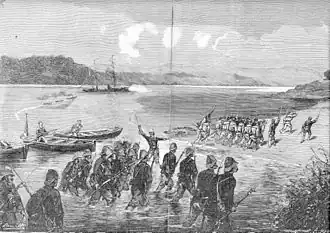 - ^ The landing force included the 27th and 31st Companies, 1st Marine Infantry Regiment (Captains Moniot and Sorin) and the 22nd Marine Artillery Battery (Captain Luce). The detachment of Cochinchinese riflemen was commanded by Lieutenant Vincentelli. The marine infantry were under the overall command of Captain Radiguet.