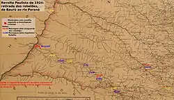 Only on 29 July did the first force cross the Paraná River, on the border, and even then it was delayed due to lack of supplies and ammunition.[26] At that time, the revolutionary army had already left the city of São Paulo and arrived in Bauru, heading towards the Paraná River.[27] Instead of heading northwest directly to Três Lagoas, they decided to reach the border via the Sorocabana Railway, passing through Botucatu.[28] On 1 August the circumscription was organized as an army detachment, with two mixed brigades and a cavalry brigade.[29] The vanguard for the occupation of Bauru would be lieutenant colonel Ciro Daltro's 1st Mixed Brigade, but he may have deliberately delayed the movement because he sympathized with his opponent. On 5 July the city was occupied by the 18th BC and the 50th RCI, but the rebels had already left the place. The Mato Grosso people met there with Colonel Malan d'Angrogne,[30] who was bringing his own loyalist column from Minas Gerais.[31]