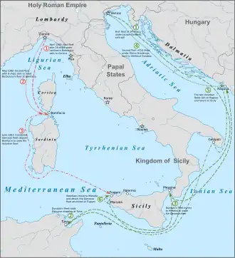 Dondulo led his fleet to Tunis, where they captured a Genoese ship in a night attack, removed its crew and cargo, and burned it. The next day, a small merchant vessel from Savona was likewise captured. On the way back to Messina, the Venetians encountered and defeated a pirate squadron of two galleys and a saetta[b] from the Genoese port of Porto Venere, capturing one of the galleys with most of its crew.[10][11]