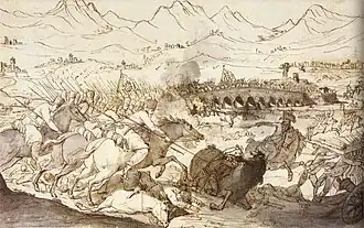 Around the same time that Olivier made his attack, Salme's Advanced Guard and Watrin's division, which had previously been in reserve, crossed the Trebbia on the far right flank. Moving in two bodies, the French force brushed aside the Austrian outpost line. The right thrust reached Ca' Pernici on the Po's south bank while the left thrust carried almost to Calendasco. Here Watrin paused because the noises from Olivier's fight were not encouraging. By this time, Melas had Olivier on the run and wished to attack across the Trebbia. Hearing of the Watrin-Salme incursion, the Austrian general was forced to deal with it first. Melas sent Liechtenstein with a task force composed of one squadron of the Lobkowitz Dragoons, two squadrons of the Archduke Joseph Hussars, 200 Cossacks and nine companies of infantry.[73] Liechtenstein acted with selfless bravery – 4 horses were killed under him.[74] Meanwhile, an artillery battery detached from the Mantua siege corps under the command of Colonel Kinsky unlimbered on the north bank of the Po. The Austrian guns proceeded to bombard their enemies, encouraging them in their decision to recross the Trebbia though the Austrians made prisoners of 300 French. The firing ended in the northern sector about 9:00 pm.[73] The French maintained a firm grip on the west bank of the Trebbia, but MacDonald's division commanders were not able to give him any estimate of their remaining strength. In a scene of horror, thousands of dead and wounded soldiers littered the bed of the Trebbia while Piacenza's Austrian garrison blindly fired cannons into the night. Realizing that neither Moreau nor La Poype were coming to his assistance, MacDonald issued the orders to retreat at 10:00 pm. As soon as the engineers bridged the Nure River, the artillery and wagon train were sent across, followed by the infantry starting about midnight.[29] On 19 June with 22,000 Suvorov beat 33,000 of MacDonald.[65]