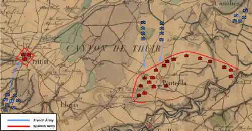 Dagobert preferred to envelop the Spanish position from the west, but Fabre and the other generals persuaded him to make a frontal attack. So he sent General of Brigade Louis Antoine Goguet's division to assault the Spanish left flank at Thuir while sending a flanking column to attack that town from the west. D'Aoust's division was ordered to attack the Spanish right flank at Mas Deu, while Dagobert led his own division in an attempt to pierce the Spanish center. Believing that Thuir was the focus of the main French effort, Ricardos posted General Crespo and only 3,000 men to defend the Spanish right. He shifted the troops of LG Pedro Téllez-Girón, 9th Duke of Osuna and LG Luis Firmín de Carvajal, Conde de la Unión to hold Thuir. Dagobert's attack pushed back the Spanish center and forced its way into the main camp at Trouillas. Meanwhile, Goguet ran into a concentration of Spanish infantry and artillery on the west flank at Thuir and was beaten. Ricardos personally led a cavalry charge to break up the flanking column, then he returned to the crisis of the battle in the center. D'Aoust merely skirmished with Crespo near Mas Deu and never mounted a serious threat to the Spanish right. This allowed Ricardos to mass his cavalry against Dagobert's division. After disposing of Goguet, de la Unión marched to Trouillas to take the French center in reverse. Three French demi-brigades were surrounded and many prisoners taken. After an all-day battle Dagobert retreated northeast to Canohès.[5]