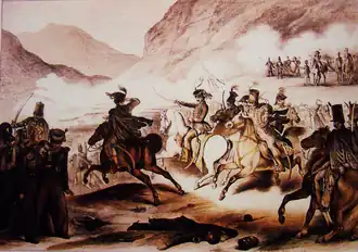 In order to hold back the Hungarians, Lieutenant General Tolstoy had to send in the battle the two companies of Cossacks and the other two companies of uhlans from the reserve,[11] which stabilized the situation, but the Hungarians left wing too received reinforcements from Dessewffy, who came personally with the four hussar companies of the 17. regiment in battle, which forced Baggahufud to start to retreat.[10] Later the Russian soldiers spoke with a mixture of fear and admiration about the "bearded Hungarian bishop clothed in red, with a cross on his chest", who with the sword in his hand caused so many devastation in their ranks. They learned only after the Hungarian surrender from 13 August, that "the angel of Death" was not a bishop but Aristid Dessewffy, clothed in his general uniform, wearing on his chest the double cross of the Hungarian Military Order of Merit.[11] As result of the Hungarian attack, the regiment of the Olga hussars from the Russian right, led by General Baggahufud was pushed back.[10]