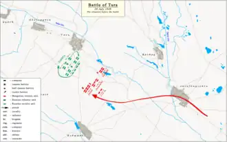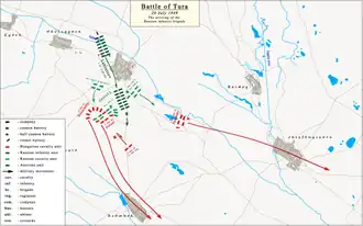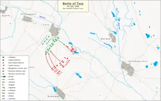 Being informed about the Hungarians approach, Lieutenant General Tolstoy deployed his troops behind Tura. Their first line was formed by eight companies of Yelizavetgrad Hussar regiment (called also Her Imperial Highness Grand Duchess Olga Nikolaevna's Hussar Regiment)[9] and the eight cannons of the 2. Don reserve battery, in the second line were the five companies of the Lubny Hussar regiment (called also His Majesty the King of Hannover's Hussar Regiment)[9] and 12 cannons of the 4. light battery. In front of the two lines Tolstoy positioned the two companies of Cossacks and the two Harkov uhlan companies which retreated earlier from Jászfényszaru, in order to slow down the Hungarians advance, and to mask the battery from the first hussar line.[8] At the same time Tolstoy was informed by Lieutenant General Labintsov that he is on his way towards Tura with the 1. brigade of the 5. infantry division.[8]