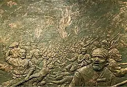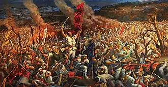 Jeon placed his army so that the rebels stretched sixteen kilometers, from Panchi to Mount Bonghwang. Jeon was at the center of this line, surrounded by flags and riding on his white horse. The government forces defended the sides (Hyopyo, Ungchi, Mount Bonghwang), while the Japanese were stationed in Ugeumchi proper. At 10:00 am, the rebels charged at Ugeumchi.[9] He sent two battalions of the Donghak Peasant Army advanced from Gyeongcheon to the southeast of Gongju Castle, and another detachment began pressuring the government forces, stationed in Iin, from the southwest to lure them away so that the major rebel forces would not meet a large governmental army in Ugeumchi.[9] Finally, around 3 p.m., the first division crossed Panji and attacked Yiyin and Hyopo, diverting the attention of the government forces in that direction. At the same time, the second division, consisting of about 10,000 soldiers, advanced towards the government forces stationed in Iin. The other 30,000 rebels were crossing Ugeumchi. However, they encountered a Japanese battalion of 280 soldiers. The Japanese gathered the Korean forces into Ugeumchi. Japanese Lieutenant Moriya, who was in overall command, repelled the attack with about 280 Kyungricheong soldiers and defended Ugeumchi with a Japanese battalion.[5] Throughout the night, both sides fiercely confronted each other, lighting fires and firing guns and cannons. As the day broke, they entered into a decisive battle.[2][6]