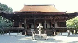 Soon, the Taira forces had made it to Mochihito's palace, where there was a guard called Hasebe Nobutsura that was left behind while Mochihito fled. He was questioned by the Taira forces on the whereabouts of Mochihito, to which he responded that he had gone to a local shrine.[8] The Taira forces, doubting this, ordered the palace be searched. Nobutsura, however, drew his sword (which had only been a ceremonial one) in response, beginning a battle in which he stood alone against 300 Taira men. He had wounded at least 56 of the Taira due to his knowledge of the palace.[8][9] Since his sword was only ceremonial, it soon broke, causing him to be captured and examined in which he did not give the whereabouts of Mochihito away, and was banished to Hōki Province.[10]