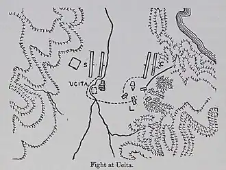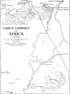 After ordering his fleet to sail to Utica, Curio began his march there around the gulf. Within three days he had reached the southern bank of the Bagradas river. Leaving the infantry there with Rebilus, he took his cavalry and rode northward to scout out a camp near Utica, the Castra Cornelia,[13] situated on a hill to the west of the town.[14] From that position he was able to assess Varus's camp, which was situated next to the town, with his further side protected by Utica's north-eastern wall, while his nearer side was protected by the sea and an outdoor theatre, ensuring that his camp could only be approached by a narrow passage.[14] Turning south, he noticed a stream of fugitives fleeing to the safety of Utica's walls, and he decided to attack the crowds to instil panic.[15] This forced Varus to send 1,000 Numidian troops (600 cavalry and 400 soldiers) to their rescue. The two forces clashed and the Numidians, unused to close quarters fighting, were repulsed, losing 120 men in the process, as the remainder of the troops retreated to the town.[15]