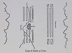 The following night, two centurions, accompanied by twenty-two men, deserted Curio's camp and made their way to Varus. They told him that Curio's troops were deeply unhappy with their commander, and that he should attempt to win them over prior to battle.[16] Varus agreed with this strategy and the following morning, he assembled his troops and led them out of their camp. Curio followed suit.[16] The two armies were separated by a valley some 70 metres (230 ft) in width, between the town and a morass, with Curio's right flank and Varus's left touching by the morass.[16] Varus's brother,[17] Sextus Quintilius Varus, a senator, emerged from Varus's troops and urged Curio's troops not to fight for their commander, but to join their own side. The troops listened in silence, and Varus returned to his camp, with Curio again doing the same.[16] That day, with Curio's men contemplating abandoning their commander, Curio summoned his officers to seek their advice. Some counselled Curio to attack immediately, before mutiny could break out. Others suggested that he wait and let Varus come to him, giving his soldiers time to calm themselves down. Curio rejected both sets of advice and decided to talk to the men directly.[18] Ordering his troops to line up, he reminded them of their oaths to Caesar, and that they had acclaimed him Imperator. By the time he was done, his troops had been brought around to supporting him, and all mutterings subsided.[19]