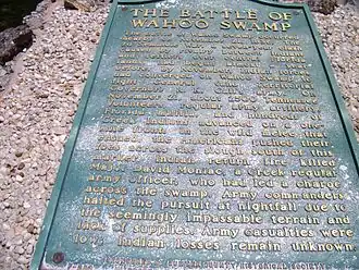 The Battle of Wahoo Swamp was an extended military engagement of the Second Seminole War fought in November 1836 in the Wahoo Swamp, approximately 50 miles northeast of Fort Brooke in Tampa and 35 miles south of Fort King in Ocala in modern Sumter County, Florida. General Richard K. Call, the territorial governor of Florida, led a mixed force consisting of Florida militia, Tennessee volunteers, Creek mercenaries, and some troops of the US Army and Marines against Seminole forces led by chiefs Osuchee and Yaholooche.