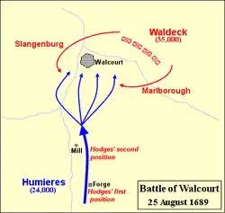 On 14 May 1689, Humières assembled his army for the new campaign in the Spanish Netherlands near Boussières on the river Sambre, where he marshalled 24 battalions and 75 squadrons, totalling 24,000 men.[10] William entrusted overall command of his 35,000 troops in the theatre to the 69-year-old Prince of Waldeck. The English contingent of 8,000 men was commanded by the Earl of Marlborough, but William remained sceptical about the quality of the English troops; compared to the Dutch troops of the period, the English lacked organisation, field administration, and a commissariat.[11] However, Waldeck watched with interest as Marlborough sought to bring order and organisation to his command, later writing that he hoped the English " … were as disciplined as they were brave" – although by September Waldeck was still lamenting their " … temperament, nonchalance, wretched clothing and the worst of shoes."[11]