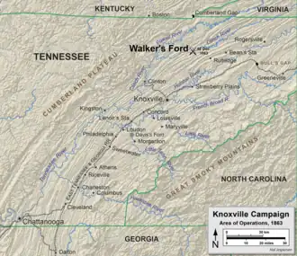 Major General Ambrose Burnside launched the Union invasion of East Tennessee in late August 1863, using two infantry divisions and cavalry from the XXIII Corps stationed in Kentucky. The operation was largely unopposed, and a Federal cavalry brigade led by John W. Foster occupied Knoxville on September 1. Burnside consolidated his control of the region at the Battle of the Cumberland Gap when he accepted the surrender of its 2,000-man Confederate garrison on September 9.[2] The strategic situation underwent a dramatic change when General Braxton Bragg's Confederate Army of Tennessee defeated the Union Army of the Cumberland at the Battle of Chickamauga on September 19–20, 1863. The result was that Bragg blockaded the Army of the Cumberland within Chattanooga.[3] Burnside was left largely on his own while the Union government rushed reinforcements to Chattanooga.[4]