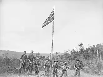 ![]() Troops from the Australian 2/23rd Infantry Battalion raise the Union flag over Wareo, 9 December 1943 | |||||||