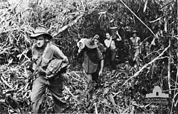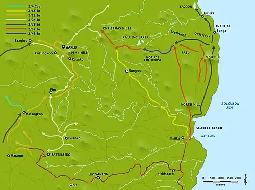 In the west, the 26th Infantry Brigade had begun patrolling operations north of Sattelberg on 27 November, moving towards the Song River.[56] The distance to Wareo was 6,000 yards (5,500 m), but due to the type of terrain, the actual distance to be traversed was about quadruple that.[57] The 2/23rd Infantry Battalion was given the task of leading the Australian advance in this sector and after striking north from Masangkoo,[45] they moved towards Fior, with the task for finding a river crossing for the brigade. No crossing could be found. At the same time the 2/24th set out from Palanko in search of jungle tracks towards the river.[56] Flank protection on the left was provided by the 2/4th Commando Squadron and a platoon from the Papuan Infantry Battalion.[58] The search was unsuccessful and after minor clashes occurred, the Australians dispatched two platoons to Fior in an effort to link up with the 2/23rd. Short of Fior, the Japanese had established themselves in strength in well dug-in positions amidst a thick bamboo grove. As the 2/24th's platoons approached, they were fired upon and forced to halt their advance, establishing a night defensive position.[56]