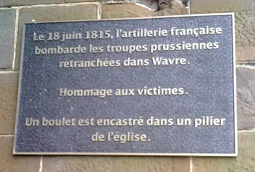 - ^ The wording on the plaque translates as: "On 18 June 1815, the French Artillery bombarded the Prussian troops retrenched in Wavre. Homage to the victims. A cannonball is (still) embedded into one of the church pillars".