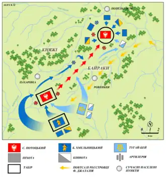The Poles managed to get out of the encirclement, but the Tatars heard about the marching Poles and began to pursue. The Tatars attacked the Poles but were repulsed, Tugay Bey all night long trying to attack but without success. At dawn Polish wagons move on Kniazhi Bairaky, Cossacks are only now arrived at the place and began artillery fire on Poles, Tatars forced the Cossacks to stop firing because they wanted to taking as much as possible captives. Again Tatars and Cossacks rushed to the assault in which Stefan Potocki was wounded and Jan Sapieha took command but the attack was repulsed. A moment later began the second attack which was successful. The Commonwealth forces were surprised by a hail of arrows from Tugay Bey's Tatar forces,[5]: 405 which diverted their escape route towards the nearby fortified village of Kniazhi Bairaky (today a tract in Kamianske Raion). There the combined forces of Tatar horsemen and Cossacks under the command of Khmelnytsky's Colonel Maksym Olshansky (aka "Crook-nose", Kryvonis, or Perebyinis) overwhelmed Potocki's tabor formation and thoroughly destroyed the fleeing force.[14][5]: 405 300 towarzysz and soldiers were taken prisoner.[20] From the battlefield fled only one soldier but other source says that survived more soldiers.[21]