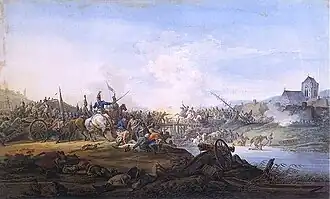 After a few hours, the Polish and Russian artillery fell silent. Within 12 hours with Russian-backed artillery fire, the infantry began advancing onto the Polish centre. Under mass artillery fire and a Russian attack, panic was induced among the Polish recruits who began escaping. After some time, Józef Poniatowski reviewed the Polish position. He organised a new battalion from the Potocki regiment and with support of battalion ordnance Ostrogoski began a counterattack. Russian infantry under fire of artillery and a Polish counterattack began withdrawal incurring heavy losses. Meanwhile, another Russian infantry unit secured the village of Zieleńce and opened fire on Polish formations. Poniatowski sent a formation of cavalry, but failed. After the village was set on fire, the Russians withdrew.[7] Meanwhile, the Russians moved artillery fire onto Polish right wing on cavalry. The soldiers felt panic. At that moment, Cossacks began a charge. Initially, that charge was stopped by field squadrons of Mokronowski brigade cavalry, but in formation of Regiment Buławy Koronnej panic ensued the rear squadrons of Mokronowski brigade. The panic of the Polish cavalry was stopped by Sanguszko and other officers. After reorganisation, Polish cavalry with support of part Lubowidzki cavalry brigade from second line began a countercharge. During this charge, the Polish cavalry destroyed the Russian cavalry and began to rally. Poniatowski sent an order to support the rally to Czapski commander of second line cavalry right wing. Czapski refused to obey because the order was not written. In truth of the matter of his decision was that he was follower of the pro-Russian Targowica Confederation.[7] During this time, a Russian regiment of grenadiers from Ekatierinoslav attacked Polish left wing. Poniatowski sent battalions from Potocki and Malczewski regiments. After decimating grenadiers under artillery and rifle fire, the Russians advance collapsed.[8]