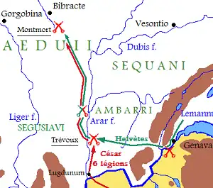 Ultimately, Caesar denied the Helvetii's request to pass through the Province. This caused the Helvetii to take an alternative route through the territory of the Aedui tribe and cross the river Arar (Saône) using rafts and boats.[2]