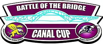 The Battle of the Bridge is the name of the all-sports rivalry between the Canisius Golden Griffins and the Niagara Purple Eagles.[1][2][3][4] Both schools are members of the Metro Atlantic Athletic Conference. The two teams compete every school year in 14 sports; men's baseball, men's and women's basketball, men's and women's cross country, men's golf, men's ice hockey, women's lacrosse, men's and women's soccer, women's softball, men's and women's swimming & diving, and women's volleyball. The overall winner of the annual series receives the Canal Cup trophy.[5] The two long-time Western New York rivals created the trophy in 2007 to enhance the historic rivalry between the two schools.[6] The name of the series is a reference to the Grand Island Bridge, which each team crosses when traveling along I-190 to the other's campus.[7][8] The name of the trophy is a reference to the Erie Canal, which separates Erie County, where Canisius is located, and Niagara County, where Niagara is located.[6]