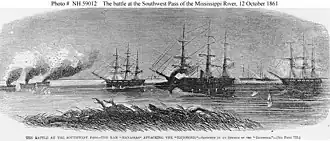 The Battle of the Head of Passes was a bloodless naval battle of the American Civil War. It was a naval raid made by the Confederate river defense fleet, also known as the “mosquito fleet” in the local media, on ships of the Union blockade squadron anchored at the Head of Passes. The mosquito fleet deployed three fire rafts, which were ignited and followed the ironclad ram CSS Manassas into the action. The attack occurred after moonset in the early hours of October 12, 1861, and routed the Union fleet, which fled in disorder down the Southwest pass of the delta. After sunrise Commodore George N. Hollins, running low on ammunition and fuel, ordered the mosquito fleet to withdraw upriver.[1]: 84–94