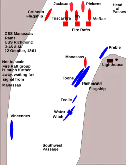 Hollins’ plan of attack was to put the CSS Manassas in the lead. Following would be Tuscarora, McRae, and Ivy moving three abreast. Each gunboat would push a fire raft, which would be ignited after a signal from Manassas indicating that she had crushed the USS Richmond. The fire rafts were chained together, and would be released by the gunboats to engulf the Union fleet as it milled helplessly after the destruction of the Richmond. If the Manassas was turned into an oven in the process, Hollins considered the sacrifice worthwhile. The Calhoun, the flagship, would remain in the rear, as would the Jackson and Pickens, seeking targets of opportunity.[16]