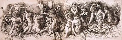 As with Andrea Mantegna, the dominant Italian printmaker of the period, based mostly in Mantua, the suggestion has been made that Pollaiuolo may not have engraved the plate himself, but hired a specialist to work from his design. However this remains a minority view.[3] Engraving was an essential skill of the goldsmith, and Pollaiuolo's workshop produced niello engraved plaques. Estimates of the date of the engraving have varied from about 1465 to about 1489.[4] As with most famous prints of the period, a number of direct copies were made in engraving and woodcut,[5] including one by "Johannes of Frankfurt" in about 1490,[6] and it was often borrowed from and imitated, for example in a drawing probably by Raphael. It is the first print to be signed with the artist's full name (on the plaque at the left rear), as opposed to the initials or monograms used by many printmakers.[7]