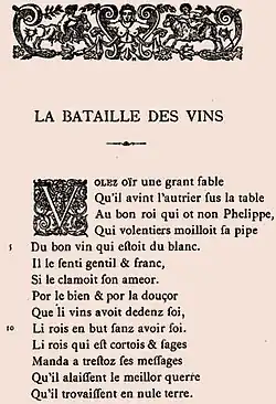 The Battle of the Wines (fr. La Bataille des Vins), sometimes called "The Battle of the Blends" was a notable poem written by Henry d'Andeli in 1224 and tells the story of a famous wine tasting organized by the French king Philip Augustus. Over 70 samples from France and across Europe, including Cyprus, Spain and the Mosel region, were tasted and judged by an English priest.[1] The priest classified the wines he tasted as either Celebrated for those which pleased him or Excommunicated for those that did not meet his standards. In the end a sweet wine from Cyprus (widely believed to be Commandaria[2]) won the overall tasting[1] and was awarded the supreme title of "Apostle".
