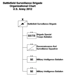 Each BfSB consisted of a headquarters and headquarters company; active component units have two military intelligence battalions while the Army National Guard BfSBs had one; each brigade had a reconnaissance and surveillance squadron consisting of a headquarters troop; two ground troops (Troops A and B) and a long-range surveillance (LRS) company; a signal company (network support company, or NSC); and a brigade support company (BSC). In 2012, the active component brigades started grouping the brigade HHC, the signal company, and the support company under a special troops battalion.