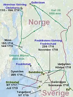 Following the renewed campaign against Norway in the autumn of 1718, and the subsequent death of Charles XII at Fredriksten fortress on November 30, the Swedish army marched back across the border into Sweden. The march would result in large casualties due to a severe winter storm, an event known as the Carolean Death March. Additionally, the Swedish east coast was being threatened by Russia. This was an opportunity for Denmark–Norway to retake areas on the Swedish west coast. Intricate plans regarding a land and naval invasion on Bohuslän existed already, and were put into motion.[29] The large supply caches that had been constructed in Strömstad in 1718 were now facing a major threat by the Dano-Norwegian counter-attack, and during late 1718 and early 1719, Swedish cannons and supplies were heading back south by ship to Gothenburg and Uddevalla. The relocating of supplies meant that northern Bohuslän would be harder to defend.[30]