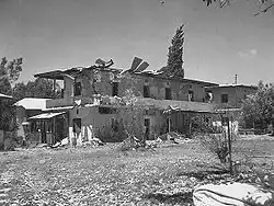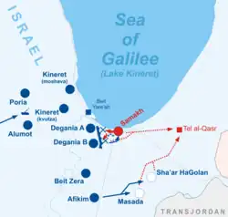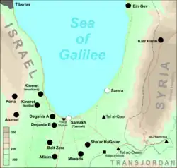 On the same day, Syrian aircraft bombed the Israeli village Kinneret and the regional Beit Yerah School, on the southwestern shore of the Sea of Galilee. By evening, Samakh (Tzemah) had fallen and a new Israeli defensive line was set up in the Deganias, facing the Syrian counterparts.[1] At night, a Palmach company from Yiftach's 3rd Battalion attempted to recapture Samakh's police station. They stealthily reached the school next to the station, but the assault on the actual fort was warded off.[26] On the morning of 19 May, a message was sent from Sha'ar HaGolan and Masada that they were preparing for an evacuation; when the order was given to stay put, the villages had already been abandoned, most defenders retreating to Afikim.[1] In the morning, when the villagers carried out an order to return to their positions, local Arabs were already present at the location.[26] The Syrian troops then captured the villages without a fight,[24] and proceeded to loot and destroy them.[27] Aharon Israeli wrote that an order was given not to disclose the flight of Masada and Sha'ar HaGolan's residents, but this became clear as fire and smoke rose from the villages, and hurt the morale of the Israelis making defensive preparations in the Deganias.[28]