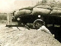 At night, a Syrian expeditionary force had attempted to infiltrate Degania Bet, but was caught and warded off, which caused the main Syrian force to attack Degania Alef first.[1] At 06:00, the Syrians started a frontal armored attack, consisting of 5 tanks, a number of armored vehicles and an infantry company.[5] The Syrians pierced the Israeli defense, but their infantry was at some distance behind the tanks. The Israelis knocked out four Syrian tanks and four armored cars with 20 mm cannons, PIATs and Molotov cocktails.[35] Meanwhile, other defenders kept small arms fire on the Syrian infantry, who stopped in citrus groves a few hundred meters from the settlements. The surviving Syrian tanks withdrew back to the Golan.[24] At 07:45, the Syrians halted their assault and dug in, still holding most of the territory between Degania Alef's fence and Samakh's police fort.[34] They left behind a number of lightly damaged or otherwise inoperable tanks that the Israelis later managed to repair.[36]