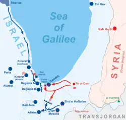 At night, a Syrian force attempted to surround the Israelis by crossing the Jordan River to the north of the Sea of Galilee, but encountered a minefield in which a senior Syrian officer was wounded.[1] This was spotted and reported by the Israelis at Tabgha,[21] and the additional reprieve allowed the Kinarot Valley villages to evacuate the children, elderly and sick, as well as conduct maneuvers which feigned massive reinforcements in the Poria-Alumot region.[1] In the panic of surprise, many men also tried to flee the frontal villages, but blockposts were set up near Afula and Yavne'el by the Military Police Service's northern command, under Yosef Pressman, who personally stopped buses and allowed only the women and children to proceed to safety.[22]