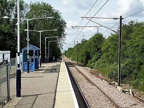Battlesbridge railway station is a stop on the Crouch Valley Line in the East of England, serving the village of Battlesbridge, Essex. It is 31 miles 40 chains (50.7 km) down the line from London Liverpool Street and is situated between Wickford to the west and South Woodham Ferrers. Train services are operated by Greater Anglia.
