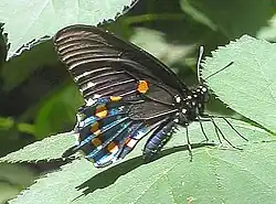 Battus philenor hirsuta, the California pipevine swallowtail or hairy pipevine swallowtail, is a subspecies of the pipevine swallowtail that is endemic to Northern California in the United States. The butterfly is black with hindwings that have iridescent green-blue coloring above and a row of red spots below; the caterpillars are black with fleshy protrusions and orange spots. This subspecies is smaller in size, hairier, and lays eggs in larger clutch sizes than the nominate subspecies.[2][3] The egg clutches are deposited on the shoot tips of the California pipevine, a perennial vine native to riparian, chaparral, and woodland ecosystems of the California Coast Ranges, Sacramento Valley, and Sierra Nevada foothills. The larvae feed exclusively on the foliage and shoot tips of the pipevine, although adults eat floral nectar from a variety of plants.[2][4][5][6] The plant contains a toxic substance, aristolochic acid. The larvae sequester the toxin, and both the juvenile and adult butterflies have high and toxic concentrations of the aristolochic acid in their tissues. Throughout the range of the species, Battus philenor, other butterflies and moths mimic the distinctive coloration of the swallowtail to avoid predators. However, there are no known mimics of the Californian subspecies.[7]