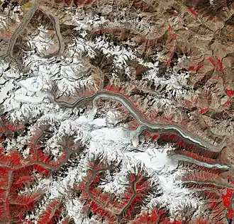 ![]() Satellite imagery of the Batura Glacier as of 2022. The big white area is the Batura Muztagh mountains; the glacier is the long snaky area on the mountains' north side. | |
