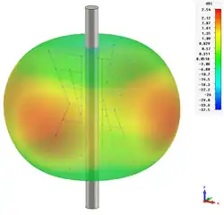 Batwing antennas are a specialized type of crossed dipole antenna, a variant of the turnstile antenna.[1] Two pairs of identical vertical batwing-shaped elements are mounted at right angles around a common mast. Element “wings” on opposite sides are fed as a dipole. To generate an omnidirectional pattern, the two dipoles are fed 90° out of phase. The antenna radiates horizontally polarized radiation in the horizontal plane. Each group of four elements at a single level is referred to as a bay. The radiation pattern is close to omnidirectional but has four small lobes (maxima) in the directions of the four elements.