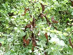 It is usually 1โ3 meters high but can grow to 8 meters. It appears to have thorns which are actually leafless shoots. Leaves are a deep shade of green. Seeds in bunches of dark brown pods.