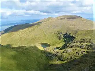 Baurtregaum (Irish: Barr Trí gCom, meaning 'top of the three hollows')[2] at 851 metres (2,792 ft), is the 13th–highest peak in Ireland on the Arderin scale,[3] and the 18th–highest peak on the Vandeleur-Lynam scale.[4][5] Baurtregaum is situated at the centre of the massif of the Slieve Mish Mountains on the Dingle Peninsula in County Kerry, Ireland. It is the tallest mountain of the Slieve Mish range, with a number of major subsidiary summits.[5][6]