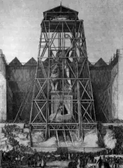 The statue is part of an ensemble which also includes a hall of fame (Ruhmeshalle) and a stairway. It was commissioned by Ludwig I of Bavaria, with the specific design being chosen by competition. It was cast at the Munich foundry of J.B. Stiglmair between 1844 and 1850 and is the first colossal statue since Classical Antiquity to consist entirely of cast bronze. It was and is up to the present day considered a technological masterpiece. Because of its size it had to be produced in several parts; it is 18.52 metres (60 ft. 9 in.) high and weighs about 87.36 tons. It rests on a stone base which is 8.92 (28 ft.) metres high.