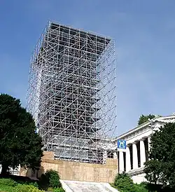During the entire period of repair, the statue was hidden under a scaffold, whose outside surfaces were made available for advertising. The base of the statue was not renovated at the time and continues to be in need of repair.