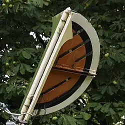 The second semaphore arm on twin-armed semaphore signals had a slightly different shape. Instead of the being at the very end of the arm, the round disc was slightly closer to the mast, so that the end of the arm projected beyond it. The predecessor to the second arm was the 'proceed slowly' disc (Langsamfahrscheibe), which could be folded away to the side when required. Up to about 1880 this was a round, green and white disc.