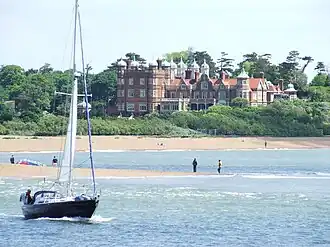 Bawdsey Manor was built in 1886 and enlarged in 1895[3] by William Quilter who was an art collector, one of the founders of the National Telephone Company, and was Liberal/Liberal Unionist Member of Parliament for Sudbury.[6] He established a steam-powered chain ferry across the River Deben in 1894 to access the nearest railway station at Felixstowe. It was known as the Bawdsey Ferry and ran until 1931.[7] The ferry now operates using a motor-launch at weekends during the summer.
