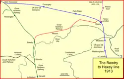 Towards the end of the nineteenth century, a new colliery was being developed at Tickhill, in South Yorkshire about three miles west of Bawtry. Rail access to Grimsby was critical to the commercial success of the pit, and the owners promoted the Tickhill Light Railway. This was to run from the colliery at Tickhill to a junction with the Great Northern Railway at Bawtry, on the East Coast Main Line, and from there it was to run on to a junction with the Great Northern and Great Eastern Joint Railway at Haxey. It was expected to be able to continue from there to Goole over the Axholme Joint Railway, at the time being promoted by the North Eastern Railway and the Lancashire and Yorkshire Railway jointly. The section from Bawtry to Haxey followed closely the route originally authorised to the Great Northern Railway in 1846, but never built by them.[1][2]