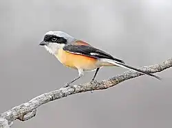 It is smallish shrike at 17 cm, maroon-brown above with a pale rump and long black tail with white edges. The underparts are white, but with buff flanks.[2] The crown and nape are grey, with a typical shrike black bandit mask through the eye. There is a small white wing patch, and the bill and legs are dark grey.[2]