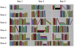 In modern practice, books are shelved from the top shelf to the bottom shelf in each bay,[1] but in historic libraries where the shelves in a bay are not adjustable, it is common for the lower shelves to be spaced to accommodate taller books, with each book having a designated location.