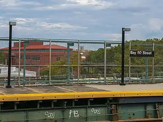 The Bay 50th Street station is a local station on the BMT West End Line of the New York City Subway, located at the intersection of Bay 50th Street and Stillwell Avenue in the Gravesend neighborhood of Brooklyn. It is served by the D train at all times. It is in front of the campus of John Dewey High School and has been adopted by its students as part of the New York City Transit Authority's Adopt-a-Station Program.